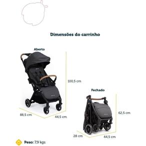 - Capota ampla com aba de sol e proteção UV50+.