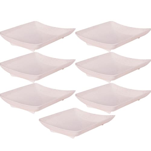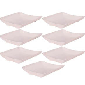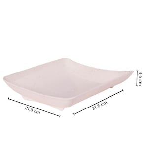 Travessa rasa quadrada de plástico com pés para servir porções, petiscos e antepastos, com decoração predominantemente branca com leves traços/ranhuras pretas por toda a peça, que traz uma aparência marmorizada super requintada à travessa.