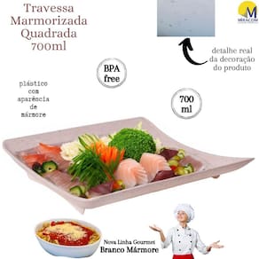 Este produto da nova linha marmorizada traz um toque peculiar, estiloso e moderno aos seus utensílios de servir. O produto é fabricado em polipropileno atóxico de alta densidade, totalmente seguro para a alimentação e livre de BPA em sua composição. A decoração no fundo do produto é permanente devido à tecnologia intraimagem aplicada em sua fabricação, que não permite desbotamento e mantém os detalhes marmorizados vivos por mais tempo. A travessa, inclusive, pode ser levada com segurança tanto ao freezer como microondas, sem comprometimento da integridade do material e tampouco da saúde de quem nele se serve. O produto suporta temperaturas extremas variantes entre -10º e 120º, embora não possa ser levado ao forno convencional.