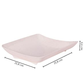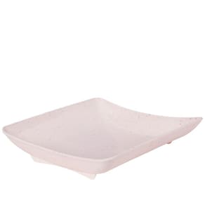 Travessa rasa quadrada de plástico com pés para servir porções, petiscos e antepastos, com decoração predominantemente branca com leves traços/ranhuras pretas por toda a peça, que traz uma aparência marmorizada super requintada à travessa.