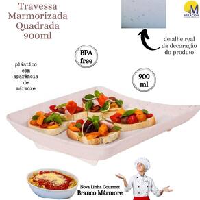 Este produto da nova linha marmorizada traz um toque peculiar, estiloso e moderno aos seus utensílios de servir. O produto é fabricado em polipropileno atóxico de alta densidade, totalmente seguro para a alimentação e livre de BPA em sua composição. A decoração no fundo do produto é permanente devido à tecnologia intraimagem aplicada em sua fabricação, que não permite desbotamento e mantém os detalhes marmorizados vivos por mais tempo. A travessa, inclusive, pode ser levada com segurança tanto ao freezer como microondas, sem comprometimento da integridade do material e tampouco da saúde de quem nele se serve. O produto suporta temperaturas extremas variantes entre -10º e 120º, embora não possa ser levado ao forno convencional.