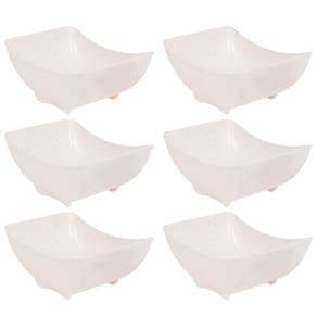 Travessa funda retangular de plástico com pés para servir porções, petiscos e antepastos, com decoração predominantemente branca com leves traços/ranhuras pretas por toda a peça, que traz uma aparência marmorizada super requintada à travessa.