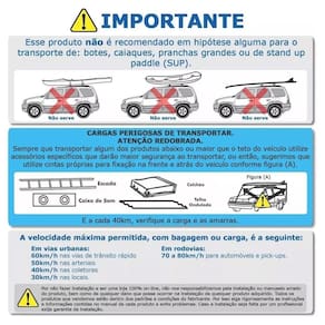 Observações Importantes: Verifique no manual do proprietário do veículo a capacidade de carga do teto. Todo rack ou Travessas sem exceções causa ruídos devido ao corte de vento. O design aerodinâmico reduz consideravelmente, mas não elimina totalmente. Não é caracterizado defeito no produto eventuais ruídos.