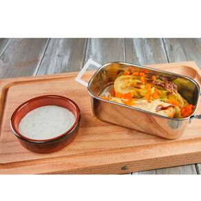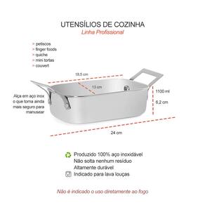 Contem: 4 Mini Travessas Capacidade: 1100 ml Medidas: 24 x 13 x 6,2 cm Material: Aço Inoxidavel Peso: 218 gramas Obs: Não é indicado o uso diretamente ao fogo.