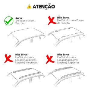 - projetado e desenvolvido para suportar até 35 kg de peso máximo, desde que distribuído de forma uniforme e equilibrada. - manual de instruções, para orientar a montagem, sua capacidade de transporte, regras de utilização e outros informes. - não amassa e nem risca o veículo - garras e suporte em ferro - não exige furações - fixação nas aberturas do friso do teto do veiculo. - fácil instalação - ótimo acabamento - excelente resistência