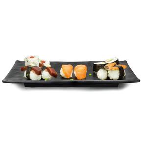 A linha Black em Melamina 100% foi desenvolvida especialmente para a culinária oriental. Essa Travessa é ideal para servir Sushi, Sashimi, e até outros pratos da culinária Oriental. Garanta uma mesa linda e original com a linha Melamina 100% Profissional Black Gourmet MixEspecificações:Ref.: GX5364Material: Melamina 100% ProfissionalMedidas do Produto - dimensões aproximadas: Peso(Kg) 0,594 (CxLxA): 30,4 x 21 x 3 cmMarca: Gourmet MixFabricante: Marcamix - Utilidades GourmetPrincipais características da Melamina 100% Profissional Gourmet Mix: - Cor e brilho característicos de porcelana- Não mancha- Não pega cheiro- Pode ir à máquina de lavar louças- Alta resistência e durabilidade- Fácil armazenamento por serem empilháveis e terem menos peso que porcelana- Possui selo internacional: próprio para alimentos- Não vai ao forno convencional ou microondasUso seguro/adequado: Para conservar a peça sempre brilhante, utilize um detergente neutro na lavagem. Pode ser lavada em máquina de lavar louças, em casa ou industriais. E para melhores resultados use sempre uma solução alcalina. Lave de preferência em água morna, e use sempre uma esponja macia. Não use o lado verde da esponja ou bucha de metal. Não leve ao forno convencional e nem ao forno de microondas, pois danificará o produto.
