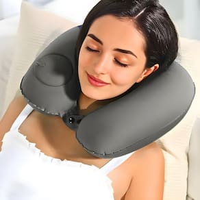 - Uso em casa para momentos de relaxamentoViaje com máximo conforto com o Travesseiro Almofada de Pescoço Inflável e Portátil na cor cinza. Design ergonômico em U, infla rapidamente e se ajusta ao seu pescoço, aliviando a tensão muscular em viagens longas ou no escritório. Compacto e fácil de transportar, perfeito para o seu bem-estar em qualquer lugar.