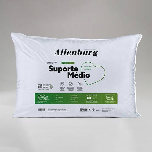 Este travesseiro ajuda a manter a curvatura natural da coluna, com suporte médio, sendo indicado para pessoas que dormem de costas. Possui revestimento em percal 180 fios 100% algodão, é antitraça, anti-mofo e não alérgico, inodoro e pode ser lavado e secado em máquina. O recheio do travesseiro Suporte Médio possui selo Vida e Saúde, com ação antimicrobiana contra fungos, ácaros e bactérias.