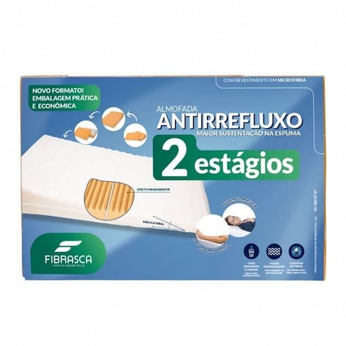 Travesseiro Antirrefluxo 2 Estágios Branco - Fibrasca Branco Travesseiro Antirrefluxo 2 Estágios - Fibrasca O Travesseiro Antirrefluxo 2 Estágios da Fibrasca foi desenvolvida para auxiliar no alívio dos sintomas de refluxo. Confeccionada em espuma de alta densidade que permite um suporte firme, possui canaletas que permitem a passagem de ar e proporcionam o efeito massageador, garantindo maior conforto na hora do descanso. O design do produto foi pensado para facilitar o seu uso no dia a dia, onde é possível separar as duas partes tornando o produto compacto e permitindo guardá-lo em pequeno. A capa possui tratamento com íons de prata que protege contra ácaros, fungos e bactérias, o fechamento é com zíper e pode ser removida e lavada em máquina. Além do uso para refluxo, ela pode ser utilizada também como apoio para as pernas, afim de elevar a posição da panturrilha, estimulando assim a circulação sanguínea e auxiliando na prevenção do aparecimento de varizes. ESPECIFICAÇÕES: - Revestimento 100% poliéster - Enchimento 100% poliuretano - Auxilia na prevenção do refluxo - Suporte firme em formato de rampa - Capa possui o tratamento íons de prata que age eliminando toda a presença de ácaros - Compacto, tornando-se mais fácil de guardar - Indicado para crianças e adultos - Hipoalergênico - Antifungos - Antibacteriano - Capa: Temperatura máxima de lavagem 40C - Enchimento: Não lavar ou molhar, não expor ao sol