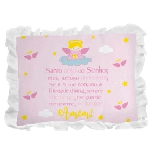Principais Características: Contém: 1 travesseiro com babado Tamanho: 28 cm x 35 cm Idade recomendada: A partir do primeiro dia de vida Material: Tecido 100% algodão e enchimento 100% poliéster Design: Estampa com a oração do Santo Anjo, trazendo uma mensagem de proteção e carinho Cor enviada para Menina.