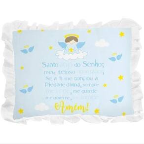 Principais Características: Contém: 1 travesseiro com babado Tamanho: 28 cm x 35 cm Idade recomendada: A partir do primeiro dia de vida Material: Tecido 100% algodão e enchimento 100% poliéster Design: Estampa com a oração do Santo Anjo, trazendo uma mensagem de proteção e carinho Cor enviada para MENINO.