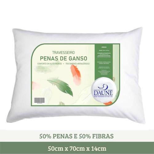 Travesseiro daune 50% penas 50% fibras silicone Zz store---------- travesseiro penas e fibras silicone - 50x70x14 ---------- zz store Conforto e aconchego são muito importantes para o bem estarDesenvolvido pelo mercado hoteleiro, o travesseiro pena de ganso híbrido tem em sua composição 50% penas e 50% fibras ocas de poliéster. Sua aceitação no mercado foi um sucesso hoje está presente em grandes redes de hotéis no mercado europeu e agora no brasil. O travesseiro híbrido daune possui tratamento antialérgico e antiácaros. Com revestimento 100% algodão com 233 fios permite um toque muito mais aconchegante e macio. Características: Marca: daune Tratamento especial antialérgico Modelo: travesseiro híbrido Enchimento: 50% penas + 50% fibras de silicone. Maior durabilidade: conforto por muito mais tempo. Revestimento: 100% algodão 233 fios. Maior frescor: através do respiro ativo que permite a fácil passagem do ar. Comprimento: 70cm Largura: 50cm Altura: 14cm Silencioso Sim. É antibacteriana Sim. Protege contra ácaros, fungos e bactérias. Tecido respirável.