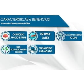 Imagens Meramente Ilustrativas. Não nos responsabilizamos pela montagem/instalação dos produtos. Todas as informações divulgadas são de responsabilidade exclusiva do fabricante/fornecedor. Tecido com Tratamento: AntiÁcaro e AntiFungo | Tipo de enchimento: Látex | Tipo de Conforto: Macio c/ Firmeza | Certificações de Qualidade: Ecologia Correto | Tempo de Garantia: 3 meses | Altura do travesseiro: Médio | Nossa Avaliação: Qualidade Excelente | Tecido da Capa de Revestimento: Algodão | Vantagens Extras do Travesseiro: Lavável | Quantidade por Embalagem: 1 unidade | Formato do Travesseiro: Tradicional | Formato de Venda: Unidade | Garantia de Fábrica: Garantia de Fábrica | É hipoalergênica: Sim | É antiácaros: Sim | É Antibacteriana: Sim | Com aromaterapia: Não | É kit: Não | É Lavável: Sim | Com Zíper: Não | Com fronha removível: Não | Com memoria: Não | Unidades por kit: 0 | É inteligente: Não | É antihongos: Sim | Fonte do produto: N/A | Condição do item: Novo | Produto: N/A | Código universal de produto (GTIN): 7896806933665 | Condição do Item: Novo | Link Site: https://www.costaricacolchoes.com.br/produtos.asp?produto=19271 | Numeral: 0 | Não se Aplica: N/A | Não Possui: Não | Link Youtube: https://www.youtube.com/watch?v=SkhM5HqThNM | ID Youtube: SkhM5HqThNM | Linha/Modelo: Duoflex | Cor Cnova: Blush | Cor Meli: Ciano | Contatos Sac Fábrica: www.duoflex.com.br | Categoria Trilha: Cama, Mesa e Banho> Travesseiro Látex | Categoria - Sub: Travesseiro Látex | Categoria - Pai: Cama, Mesa e Banho | Comprimento Embalagem: 40.00 | Largura Embalagem: 60.00 | Altura Embalagem: 13.00 | Peso: 2.28 Kg | Kit: 0 | Peso Real Kg: 2.28 | Peso Cubado: 9.50 | Volumes: 1 | M3: 0.04 | Comprimento/Profundidade: 65 cm | Largura: 45 cm | Altura: 13 cm | Tamanho Montado: Larg:45.00 x Comp/Prof:65.00 x Alt: 13.00 | Comprimento/Profundidade Montado: 65.00 | Largura Montado: 45.00 | Altura Montado: 13.00 | Data Cadastro: 2023-7-1 14:42:41 | Sigla Estoque: 6 | Marca: Duoflex Ean: 7896806933665