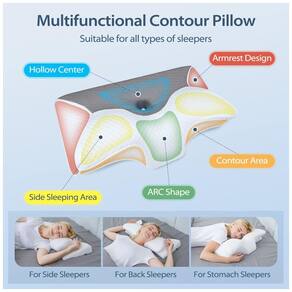 Espuma viscoelástica de recuperação suave Feita de núcleo de espuma viscoelástica pura, a almofada HOMCA recupera suavemente em 3 a 5 segundos e ajusta a sua firmeza de forma inteligente ao detectar a temperatura corporal. Nosso travesseiro permanece macio e não deformável sob uso prolongado e forte pressão. Alivia dores no pescoço e ombros Recomendado por médicos, o travesseiro HOMCA é projetado ergonomicamente para fornecer suporte e se alinhar ao nosso corpo, reduzindo assim as dores no pescoço e nos ombros. Se você está sofrendo de dor no pescoço, dormir de costas entre os dois chifres manterá o pescoço e os ombros em posição durante a noite. Também oferece suporte para aqueles que estão se recuperando de uma cirurgia na mandíbula ou têm problemas de sono cas por insônia, ronco ou sono incorreto Feito para dorminhoco nas costas, dorminhoco lateral, dorminhoco do estômago o travesseiro HOMCA acomoda todas as posições de dormir Para dorminhoco lateral, o design oco central irá liberar a pressão do ouvido e manter a passagem de ar livre, enquanto seu design com sulco e curva corporal permite que o braço descanse natural e confortavelmente para uma ótima noite de sono. Experiência ideal para dormir Nosso travesseiro de mistura patenteada de rayon , poliéster hipoalergênico é macio e sedoso ao toque, e sua estrutura respirável permite que o ar circule para mantê lo fresco durante a noite. Zíper escondido no travesseiro para fácil substituição e limpeza. Opções de presente adequadas a almofada HOMCA é um presente maravilhoso e atencioso para sua família e amigos preocupados com a saúde Marca: Não Informado