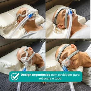 Seu design anatômico oferece cavidades laterais que acomodam perfeitamente a máscara e o tubo, evitando desconforto e vazamentos de ar durante a noite.