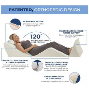 Este travesseiro ortopédico de corpo inteiro em cunha de 4 peças é ideal para quem busca conforto e suporte ao dormir, relaxar ou se recuperar. O conjunto inclui três travesseiros de cunha com suporte lombar embutido, almofada de cunha para as costas, almofada de elevação para as pernas e joelhos, e apoio para os pés. A cunha de espuma proporciona um posicionamento confortável sem peso, aliviando a pressão e ajudando a aliviar a dor nas costas. A inclinação gradual também oferece o posicionamento perfeito para dormir elevado em uma cunha de cama, ajudando a aliviar o desconforto respiratório, digestivo, circulatório ou muscular. O travesseiro é configurável em 9 posições diferentes, permitindo que você ajuste o suporte de acordo com suas necessidades. A espuma é durável e de alta resiliência, perfeita para uso diário ou dobrável para armazenamento ou viagem. A capa com zíper é antiderrapante, respirável e lavável à máquina, com tecido microaderente na parte inferior das cunhas, evitando que as almofadas triangulares se movam durante o uso ou se forem usadas separadamente. Como bônus, o travesseiro de viagem Half Moon Wedge oferece suporte cervical para ajudar a atingir o alinhamento perfeito da coluna cervical.