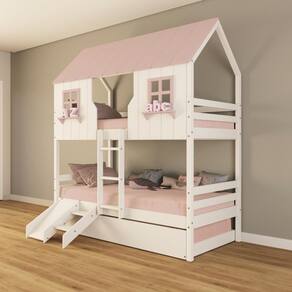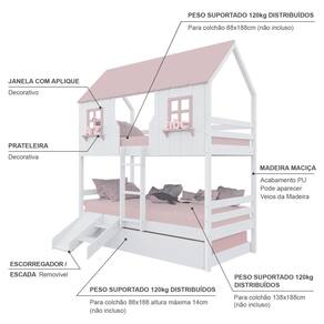 Diferenciais: Escada Fixa, Auxiliar com Rodízios, Casinha e Telhado com fechamento em MDF, Janela e Prateleira Decorativa, kit Escada/ Escorregador.