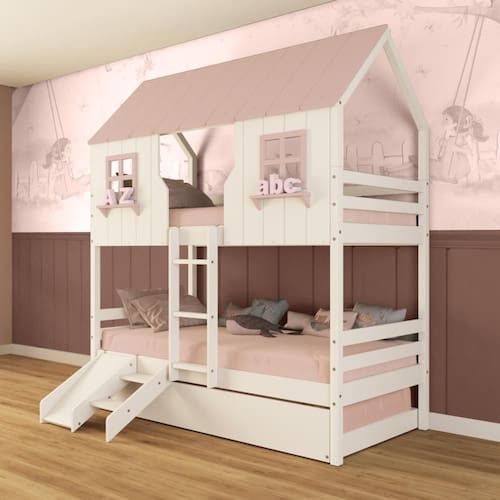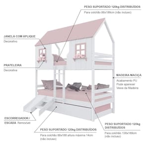 Diferenciais: Escada Fixa, Auxiliar com Rodízios, Casinha e Telhado com fechamento em MDF, Janela e Prateleira Decorativa, kit Escada/ Escorregador.