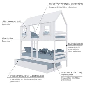 Material Principal: Madeira Maciça | Cor: Branco | Necessita Montagem: Sim | Acompanha Colchão: Não | Tipo de Cama: Beliche Solteiro