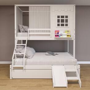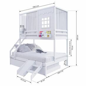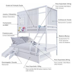 Diferenciais: Auxiliar com 04 Rodízios, Escada com Leve Curvatura, Kit Escada/ Escorregador, Cortina, Casinha com fechamento em MDF, Janela e Prateleira para Livros e Decoração, Montagem Reversível (Lado Direito ou Lado Esquerdo)