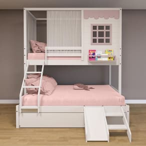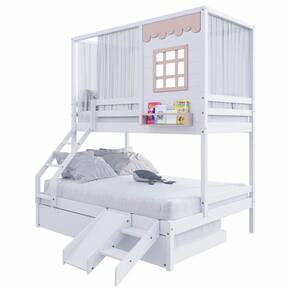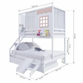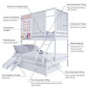 Diferenciais:Auxiliar com 04 Rodízios, Escada com Leve Curvatura, Kit Escada/ Escorregador, Cortina, Casinha com fechamento em MDF, Janela e Prateleira para Livros e Decoração, Montagem Reversível (Lado Direito ou Lado Esquerdo)