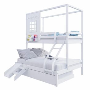 Diferenciais: Auxiliar com 04 Rodízios, Escada com Leve Curvatura, Kit Escada/ Escorregador, Casinha com fechamento em MDF, Janela e Prateleira para Livros e Decoração, Montagem Reversível (Lado Direito ou Lado Esquerdo)