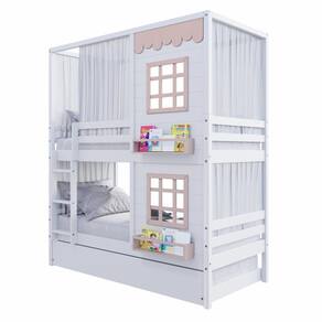 Diferenciais: Escada Fixa, Auxiliar com 4 Rodízios, Kit Cortina Superior e Inferior, Casinha com fechamento em MDF, 02 Janelas e Prateleira para Livros e Decoração, Montagem Reversível (Lado Direito ou Lado Esquerdo)