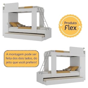 O Treliche com Colchão Incluso e Barra de Proteção Multimóveis FG329 é produzido em MDP com pintura UV acetinada, garantindo durabilidade e resistência, suporta até 80kg nas camas principais e 70kg na cama auxiliar, possui barra de proteção na cama superior para evitar quedas, além de uma porta lateral com prateleira interna, oferecendo amplo espaço para organizar pertences. A escada metálica em ângulo facilita o acesso à cama superior, tornando sua utilização prática e segura. Versátil, pode ser montado dos dois lados - esquerdo ou direito. Para acrescentar conforto, acompanha colchão D23 com tratamento antiácaro e antialérgico, proporcionando noites de sono mais tranquilas e saudáveis.