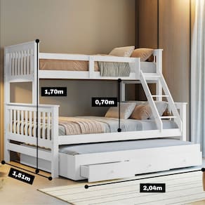 Treliche Com Gavetas de madeira maciça de pinus e MDF de 2,2cm de espessura = 2 Camas De Casal + 1 Cama De Solteiro