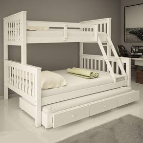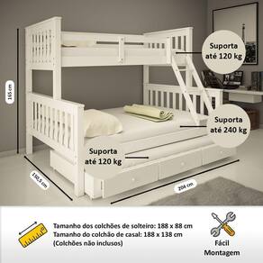 Modelo: B10501Material: Madeira Maciça de Pinus de Reflorestamento mais MDF 22mmPintura/Acabamento: Laca Branco/Castanho 30% de Brilho, Podendo Aparecer os Veios da MadeiraMedidas das Gavetas: A: 17 cm - L: 60 cm - P: 53,5 cmMedidas dos Colchões da Cama de Solteiro (cm x cm): 188x88 (Não Incluso)Medidas dos Colchões da Cama de Casal (cm x cm): 188x138 (Não Incluso)Medidas dos Colchões da Cama Auxiliar (cm x cm): 188x88x14 (Não Incluso)Peso Suportado Cama de Solteiro: 120 KgPeso Suportado Cama de Casal: 240 KgPeso Suportado Cama auxiliar: 120 kgAcessórios: Escada Fixa e Cama Auxiliar (com rodízios) (gaveta com puxador )
