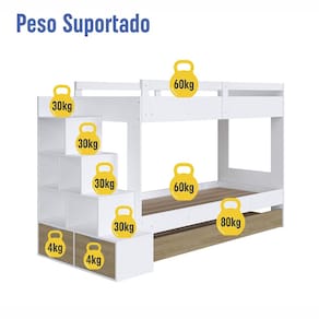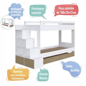 Treliche Infantil com Escada, Nichos e Gavetas BI005 Linha Infanto Branco Aveiro OAK Completa Móveis