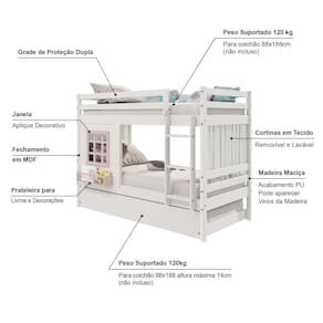 Diferenciais: Escada Fixa, Grade de Proteção Dupla, Auxiliar com 4 Rodízios,Janela com fechamento em MDF e Prateleira para Livros e Decoração, Cortina.