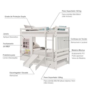Diferenciais: Escada Fixa, Grade de Proteção Dupla, Auxiliar com 4 Rodízios,Janela com fechamento em MDF e Prateleira para Livros e Decoração, Cortina, Kit Escada/ Escorregador.