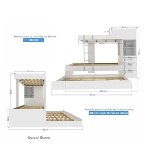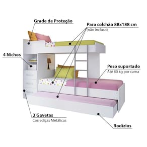 Características - Branco - Estrutura: MDP - Acabamento: Pintura UV /Ecobril - 3 Gavetas - Corrediças Metálicas - Puxadores em ABS - 4 Nichos - Escada em alumínio - Grade de proteção lateral na cama superior - 4 Rodízios - Para colchão 88x188cm (não incluso) - Recomendado o uso de colchão para cama auxiliar com altura de até 12 cm - Peso suportado por cama: 80 kg - Produto entregue desmontado - Marca: Santos Andirá