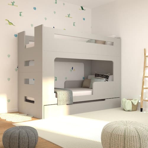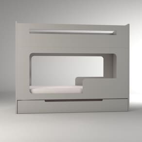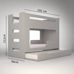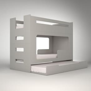 Treliche Lumi Cinza. Otimização de espaço, sem deixar de lado o estilo e a personalização. A Linha Lumi surge como uma ótima alternativa para ambientes pequenos. É utilizado em toda a sua estrutura MDF das melhores marcas do país, com espessura de 2,5cm, o que torna o móvel muito mais forte e durável. Possui um design moderno, com as laterais fresadas em chapas inteiriças, tendo lateral, pés e meia guarda em uma só peça. A escada de acesso à cama superior é embutida na peseira, também fresada na própria peça. A cama superior possui grade de proteção reforçada, para maior segurança da criança. Utilizado colchão padrão solteiro (1,88x0,88mt) nas 3 camas. A pintura laca traz o acabamento de alto padrão. Pode ser adquirido nas versões Com escorregador ou Beliche. Marca: Timber Ean: 7909903312483