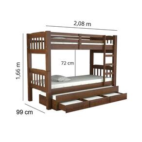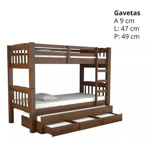 Treliche itália castanho com 3 gavetas - Kamabel A treliche Italia com 3 gavetas em Madeira Maciça reúne o estilo e a sofisticação que você precisa, o seu ambiente sem dúvida ficará mais lindo e decorado! Produzida em excelente estrutura que oferece mais resistência ao móvel e com perfeito acabamento em Pintura U.V. que proporciona sensação ao toque e garante maior durabilidade. Tenha mais espaço, conforto e praticidade em suas noites de sono!Características GeraisPara Colchão 0.88 x 1.88 Obs: OS COLCHÕES NAO ACOMPANHAM O PRODUTO!!Produto fabricado em 100% Madeira Maciça Pinus.Espessuras dos pês 0.8 x 0.8 cmGrade Lateral maciça reforçada;Possui Estrado Reforçado;Exclusiva Grade de Proteção na parte lateralSuporta no Máximo 150 kg;Possui um Fino Acabamento;Cama Auxiliar com 3 gavetas e rodízios.Ripas e sarrafos do estrado em madeira maciça.colchoes com máximo 14cm de altura para utilizar na cama AuxiliarProduto versátil encaixa em vários ambientes.Lindo design.Pode colocar escada em ambos os ladosMedidas aproximadas:Produto montado: Altura: 166 cm Largura: 208 cm Profundidade: 99 cmGavetões área útil: Altura: 9,5cm x Largura 47,5cm x Profundidade: 47,5cmAltura de cada travessa 83cmAs barras tem 12cm de larguraMedida da cama auxiliar:Altura 43cm x largura 89cm x Comprimento 190cmEspaço do vão entre as camas 72cm Produto entregue desmontado em 3 volumes Cubagem: 0,2912 Peso: 49 kg.