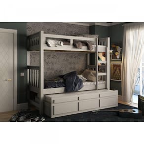 Madeira maciça de Pinus. Cama auxiliar possuí sistema de rodízio fixo, gavetas todas com corrediças em madeira central com deslizante em plástico, estrados em madeira de pinus largura 20mm. Pintura: PU verniz - Estrutura: Madeira Maciça. Fundo compensado 4mm. Ideal para o seu lar. Acabamento da Gaveta: Pintura Acabamento da Porta: Acabamento da Prateleira: Acabamento dos Pés: Pintura Acompanha Cama Auxiliar: Sim Acompanha Colchão: Não Altura do Estrado até o Chão: 0,0137 cm Altura do Estrado Superior até o Chão: 143 cm Altura dos Pés: 48 cm Ambiente Principal: Quarto Cama Auxiliar Acompanha Colchão: Não Cama Auxiliar com Rodízio: Sim Cama Auxiliar Suporta Até (kg): 80 kg Complexidade da Montagem: Média: pode ser montado por mais de uma pessoa e/ou necessite de maior conhecimento para montagem Cor: Cinza Cor do Produto: Cinza Cor Flex: Escala de Brilho: Fosco Escala de Brilho da Gaveta: Fosco Escala de Brilho da Porta: Escala de Brilho da Prateleira: Gaveta com Chave: Não Informações Complementares: Itens Inclusos: 1 Treliche, kit de ferragens e manual de montagem Linha ou Coleção: Manual de Especificação Técnica: Manual de Montagem e Instalação: https://cdn2.madeiramadeira.com.br/atributo/moveis-saraiva/545112-it-treliche.pdf Material da Escada: Madeira de Pinus Material da Gaveta: Madeira Maciça Material da Porta: Material da Prateleira: Material do Estrado: Pinus Material do Puxador da Gaveta: Material do Puxador da Porta: Material dos Pés: Madeira Maciça Material Principal: Madeira Maciça Medida da Escrivaninha (A x L x P): Montagem Flex: Necessita Montagem: Sim Número de Camas: 03 Origem do Produto: Nacional Permite a Utilização de Cama Auxiliar: Sim Peso: 87 kg Peso Máximo por Gaveta: 5 kg Peso Máximo por Prateleira: kg Peso Suportado por cada cama: 80 kg Possui Escrivaninha: Não Possui Pés: 04 Possui Portas: Não Possui Prateleiras: Não Possui Rodízio: Sim Recomendações de Uso, Manutenção e Limpeza: Limpeza com pano umedecido, não aplicar lustra móveis. Rodízio com Trava: Não Sapatas Niveladoras: Não Sistema de Montagem: Parafusos, Cavilhas e Roldanas Suporta Até (kg): 240 kg Tamanho: Tamanho do Colchão Indicado (L x C): 88cm x 188cm Altura de 14 - 17cm Tamanho do Colchão Indicado Cama Auxiliar: 188 x 88cm Tipo de Colchão: Solteiro Tipo de Corrediça da Gaveta: Madeira Tipo de Dobradiça/Corrediça da Porta: Tipo de Estrado: Removível Tipo de Madeira Maciça: Pinus Tipo de Madeira Maciça da Gaveta: Pinus Tipo de Madeira Maciça da Porta: Tipo de Madeira Maciça da Prateleira: Tipo de Madeira Maciça do Puxador da Gaveta: Tipo de Madeira Maciça do Puxador da Porta: Tipo de Madeira Maciça dos Pés: Pinus Tipo de Porta: Tipo de Puxador da Gaveta: Embutido Tipo de Puxador da Porta: Trava de Segurança: Não