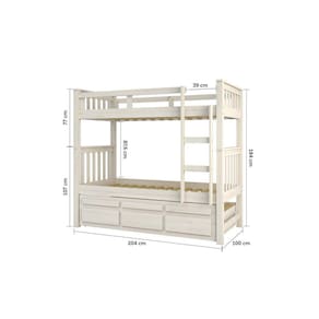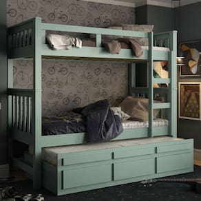 Madeira maciça de Pinus. Cama auxiliar possuí sistema de rodízio fixo, gavetas todas com corrediças em madeira central com deslizante em plástico, estrados em madeira de pinus largura 20mm. Pintura: PU verniz - Estrutura: Madeira Maciça. Fundo compensado 4mm. Ideal para o seu lar. Acabamento da Gaveta: Pintura Acabamento da Porta: Acabamento da Prateleira: Acabamento dos Pés: Pintura Acompanha Cama Auxiliar: Sim Acompanha Colchão: Não Altura do Estrado até o Chão: 0,0137 cm Altura do Estrado Superior até o Chão: 143 cm Altura dos Pés: 48 cm Ambiente Principal: Quarto Cama Auxiliar Acompanha Colchão: Não Cama Auxiliar com Rodízio: Sim Cama Auxiliar Suporta Até (kg): 80 kg Complexidade da Montagem: Média: pode ser montado por mais de uma pessoa e/ou necessite de maior conhecimento para montagem Cor: Verde Cor do Produto: Verde Cor Flex: Escala de Brilho: Fosco Escala de Brilho da Gaveta: Fosco Escala de Brilho da Porta: Escala de Brilho da Prateleira: Gaveta com Chave: Não Informações Complementares: Itens Inclusos: 1 Treliche, kit de ferragens e manual de montagem Linha ou Coleção: Manual de Especificação Técnica: Manual de Montagem e Instalação: https://cdn2.madeiramadeira.com.br/atributo/moveis-saraiva/545112-it-treliche.pdf Material da Escada: Madeira de Pinus Material da Gaveta: Madeira Maciça Material da Porta: Material da Prateleira: Material do Estrado: Pinus Material do Puxador da Gaveta: Material do Puxador da Porta: Material dos Pés: Madeira Maciça Material Principal: Madeira Maciça Medida da Escrivaninha (A x L x P): Montagem Flex: Necessita Montagem: Sim Número de Camas: 03 Origem do Produto: Nacional Permite a Utilização de Cama Auxiliar: Sim Peso: 87 kg Peso Máximo por Gaveta: 5 kg Peso Máximo por Prateleira: kg Peso Suportado por cada cama: 80 kg Possui Escrivaninha: Não Possui Pés: 04 Possui Portas: Não Possui Prateleiras: Não Possui Rodízio: Sim Recomendações de Uso, Manutenção e Limpeza: Limpeza com pano umedecido, não aplicar lustra móveis. Rodízio com Trava: Não Sapatas Niveladoras: Não Sistema de Montagem: Parafusos, Cavilhas e Roldanas Suporta Até (kg): 240 kg Tamanho: Tamanho do Colchão Indicado (L x C): 88cm x 188cm Altura de 14 - 17cm Tamanho do Colchão Indicado Cama Auxiliar: 188 x 88cm Tipo de Colchão: Solteiro Tipo de Corrediça da Gaveta: Madeira Tipo de Dobradiça/Corrediça da Porta: Tipo de Estrado: Removível Tipo de Madeira Maciça: Pinus Tipo de Madeira Maciça da Gaveta: Pinus Tipo de Madeira Maciça da Porta: Tipo de Madeira Maciça da Prateleira: Tipo de Madeira Maciça do Puxador da Gaveta: Tipo de Madeira Maciça do Puxador da Porta: Tipo de Madeira Maciça dos Pés: Pinus Tipo de Porta: Tipo de Puxador da Gaveta: Embutido Tipo de Puxador da Porta: Trava de Segurança: Não
