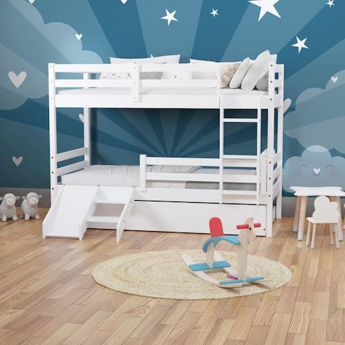 Diferenciais: Todo em Madeira, Escada Fixa, Grade de Proteção Dupla, Grade Removível, Auxiliar com 4 Rodízios e Kit Escadinha/Escorrega.