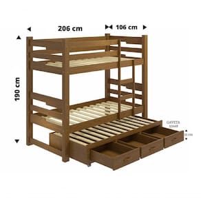 Possui escada lateral e 3 camas de solteiro sendo 1 cama auxiliar, além de proteção lateral localizada na parte superior do produto, garantindo total .