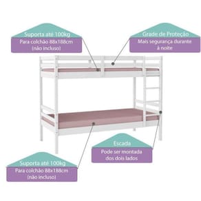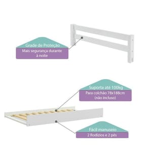 A cama superior conta com grade em todo o redor garantindo maior segurança. A escada com 4 degraus pode ser montada do lado direito ou esquerdo, essa escolha deve ser feita conforme o posicionamento da cama no quarto, para facilitar o vai e vem diário no ambiente. A cama inferior conta com grade somente na parte frontal. Além disso, é possível transformar o beliche em duas camas de solteiro. E sob toda essa incrível estrutura, fica a cama auxiliar com 2 rodinhas de fácil manuseio.