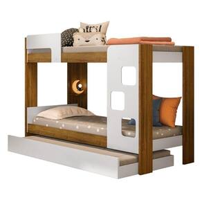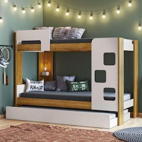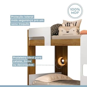 Beliche equipada com cantoneira para celular e proteção lateral na cama superior. Sua escada é projetada na frente para facilitar o acesso à cama superior quando montada em ambiente apertada. Pés e barras em MDF de 25mm dando total resistência e segurança durante o uso. Acabamento acetinado.
