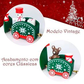 Este encantador trem decorativo natalino é uma peça perfeita para enriquecer sua decoração de Natal com um toque nostálgico e festivo. Fabricado artesanalmente em madeira, o trem possui um design vintage que evoca o charme dos Natais tradicionais. Composto por uma locomotiva e três vagões, cada detalhe é cuidadosamente pintado à mão, o que torna cada peça única e especial, com pequenas variações na pintura que realçam sua exclusividade. Nos vagões, passageiros muito especiais trazem ainda mais vida e alegria ao cenário: um urso, um boneco de neve alegre e um menino encantado com o espírito natalino. As rodas, também de madeira, complementam o visual rústico e autêntico, mas não permitem o movimento, reforçando o caráter decorativo da peça. Os vagões e a locomotiva se conectam facilmente por meio de encaixes simples, facilitando o manuseio e a disposição do trem no ambiente. Por ser uma peça delicada e decorativa, recomenda-se mantê-la fora do alcance de crianças menores de 3 anos, pois pode conter partes pequenas. Este trem natalino é uma adição atemporal à sua decoração de festas, ideal para compor mesas, aparadores ou estantes, trazendo calor e magia ao seu lar durante a temporada mais encantadora do ano. Homologação Inmetro: IP-BRI-2688/2021-2 Marca: Klizz Marca: Klizz
