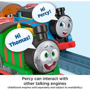 Trem de brinquedo motorizado Thomas & Friends Talking Percy Engine com frases sonoras e helicóptero Harold para crianças pré-escolares de 3 anos ou mais - Trem de brinquedo motorizado com motor Percy com frases e sons de personagens reais, além do helicóptero Harold e uma peça de carga “pilha de lixo” - Pressione o botão na parte superior do motor para fazer o trem correr junto com sons e frases divertidos - Quando Percy encontra qualquer um dos outros motores falantes, o os motores se reconhecerão e conversarão entre si! (Cada um é vendido separadamente e está sujeito à disponibilidade.) - Este trem de brinquedo movido a bateria é compatível com qualquer pista da Thomas & Friends, exceto madeira (conjuntos de trilhos vendidos separadamente). - Para amantes de trens pré-escolares com 3 anos ou mais