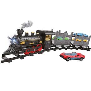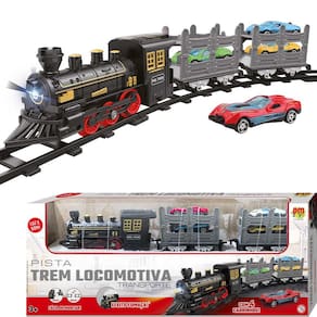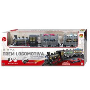 Apresentamos a Pista Trem Locomotiva Transporte! Com luz, som e um efeito de fumaça que vai encantar a garotada, este brinquedo é pura diversão! O encaixe dos trilhos é fácil e inclui 2 vagões de carga além dos 4 carrinhos para um transporte cheio de aventuras! Para o trenzinho soltar fumaça basta colocar agua no lugar indicado. Facil de Montar 01 Locomotiva; ( 21cm ) 02 vagões; ( 15cm cada) 04 carrinhos; ( 08cm cada) 10 trilhos; ( total 314cm) 01 conta gotas Luz; Som; Efeito fumaça (produzido pelo vapor d'água); Montagem fácil; Diâmetro: 116cm Largura dos Trilhos: 05cm Largura entre Rodas: 04cm Comprimento total Trilhos: 3 metros e 14cm Medida pista: 116 cm x 92 cm Utiliza 04 pilhas AA (não incluídas) Composição: plásticos ABS e PP, metal. Garantia contra defeitos de Fabricação