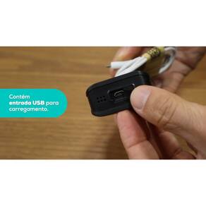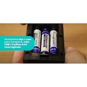 Acompanha 3 pilhas AAA (reccaregáveis), cabo USB e case para transporte.