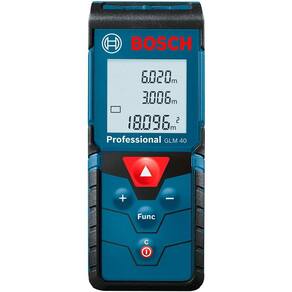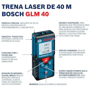 Trena à Laser GLM 40 Medidor de Distância à Laser 40 Metros BOSCH Medições com mais facilidade, agilidade e precisão Diversidade de funções e robustez, com 40 metros de alcance e proteção contra poeira e água Contém memória de 10 medições, além de possuir diversas funções, como medição contínua, cálculo de área, volume, Pitágoras simples, adição e subtração Possui ajuste da unidade de medida em metros, pés e polegadas DADOS TÉCNICOS: Díodo laser: 635nm, < 1mW Amplitude de medição: 0,15 40 m Classe de laser: 2 Precisão de medição, normal: mais ou menos: 1,5 mm Tempo de medição, normal: menor que 0,5 seg. Tempo de medição máx.: 4s Alimentação de energia: 2 x 1,5 V LR03 (AAA) Dispositivo de desconexão automática: 5 min. Unidades de medida: m/cm, pés/polegadas Número dos valores da memória: 10 Vida útil da bateria, medições individuais aprox.: 5.000 Proteção contra pó e salpicos de água: IP 54 Proteção conta pó e respingos dágua IP 54 Alcance: 0,15 40,00 metros Entrada para tripé: 1/4 e 5/8 POL APLICAÇÕES: Medição de distâncias e alturas com um clique, medição contínua conforme o medidor é movimentado, medição de área e volume, medição de altura indireta. Medição de distâncias: você só precisa apontar o laser para o local que deseja medir e pressionar o botão Medição contínua: veja o resultado aparecendo na tela em tempo real conforme move o medidor Medição de área: meça a largura e o comprimento e o medidor calcula na hora quantos metros quadrados tem o local. Medição de volume: meça a largura, o comprimento, a altura e o medidor calcula na hora quantos metros cúbicos tem o ambiente. Medição de altura indireta: calcule facilmente a altura até mesmo de locais que não têm um teto como anteparo. PÚBLICO ALVO: Orçamentistas (exemplos marceneiros, pintores, pedreiros, etc.), instaladores em geral, engenheiros, arquitetos, profissionais de construção em geral. CERTIFICADO: ISO 9001 DIFERENCIAL TÉCNICO: Trena laser para medições de até 40 metros que faz as contas para Você: calcule áreas, volumes e até alturas direto no aparelho. ACOMPANHA: 1 Trena Laser de 40 m Bosch GLM 40, 1 Manual de instruções, 1 Certificado do fabricante, 2 pilhas AAA, 1 Bolsa de proteção Modelo: GLM 40 Código de Fábrica: 0601072900-000 Marca: BOSCH Garantia: 12 MESES Embalagem: Caixa de papelão