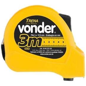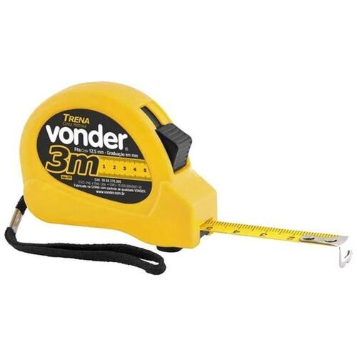 Indicada para medições em geral. Possui estojo anatômico em ABS de alta resistência. Fita em aço com pintura fosca antirreflexo, numeração contínua e graduação em milímetros, facilitando a leitura e proporcionando maior precisão. Possui trava da fita que facilita a leitura, alça em nylon e presilha para cinto, auxiliando no transporte e segurança durante o uso. Trena de Aço 3m x 12,5mm - Vonder 38.68.370.003 Indicada para medições em geral. Possui estojo anatômico em ABS de alta resistência. Fita em aço com pintura fosca antirreflexo, numeração contínua e graduação em milímetros, facilitando a leitura e proporcionando maior precisão. Possui trava da fita que facilita a leitura, alça em nylon e presilha para cinto, auxiliando no transporte e segurança durante o uso. Detalhes Técnicos: Comprimento da trena:3 m Largura da fita da trena: 12,5 mm Revestimento da fita da trena: pintado Acabamento da fita da trena: pintura fosca antirreflexo Graduação da trena: mm Material da caixa da trena: ABS de alta resistência Sistema de trava da trena: botão Classe de precisão: classe II