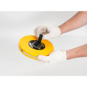 Caixa fechada em ABS de alta resistência, fita com revestimento em PVC amarelo resistente à umidade e variações de temperatura e graduação em mm/pol