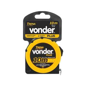 Trena de fita de aco 10mts x 25mm vonder plus Descrição: Trena de aço 10m com estojo anatômico em abs, borracha termoplástica que confere maior resistência e conforto no manuseio, fita em aço com pintura fosca antirreflexo, numeração contínua e graduação em milímetros/polegadas, facilitando a leitura e proporcionando maior precisão. Possui trava da fita que facilita a leitura, alça em nylon e presilha para cinto, auxiliando no transporte e segurança durante o uso.